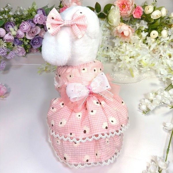 예쁜 데이지 꽃이 고방체크 위에 내려앉은 면 드레스 리본포함, 스커트와 소매에 고급 레이스 장식이 시원함과 귀여움을 더 줍니다 귀여운 2단 스커트 목둘레,소매, 가슴, 배부분에 고무줄 처리로 아가들 입고 벗기 편안하고 핏도 좋아요
