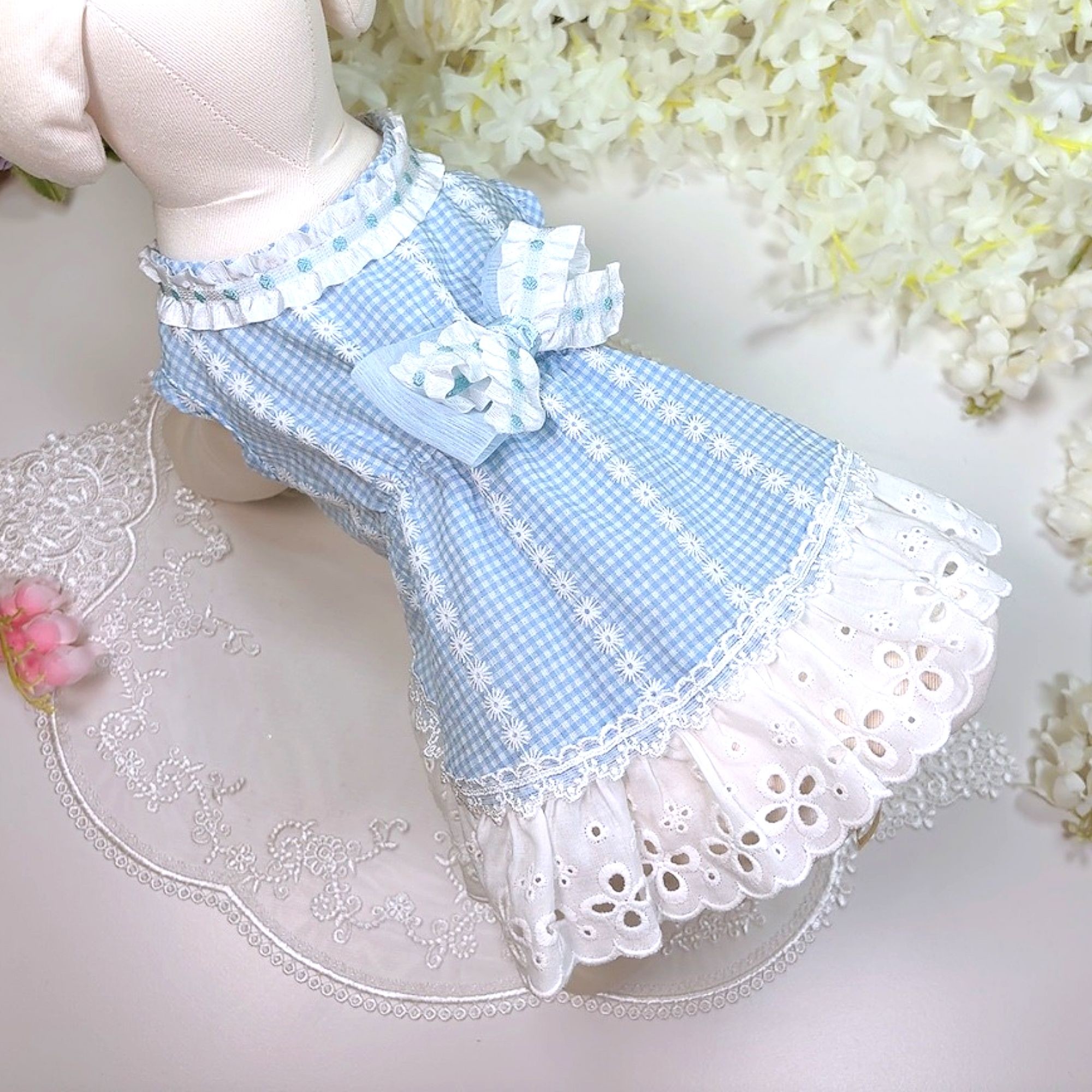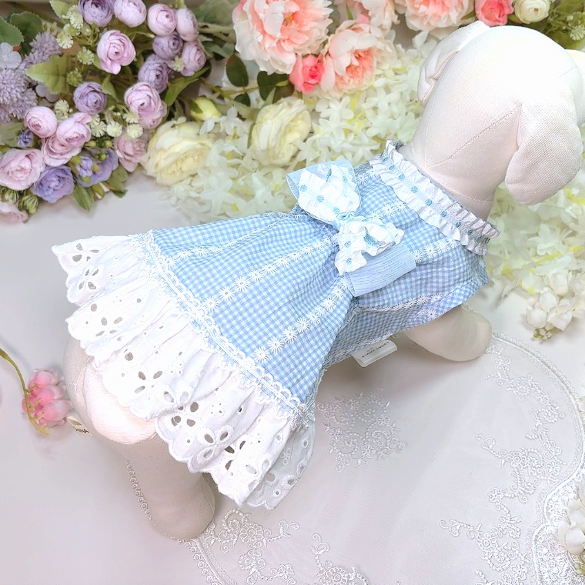 고급스런 블루고방체크에 하얀 플라워 프린트 드레스 ♥